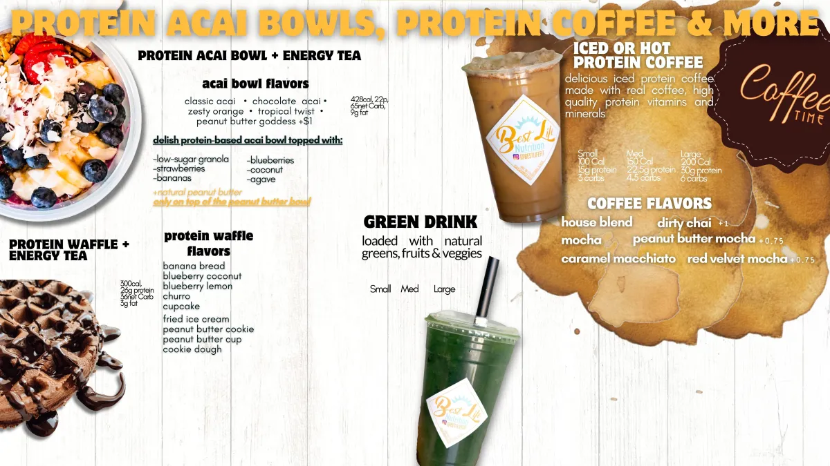 At Best Life Nutrition, we believe in offering more than just great-tasting products. We specialize in healthy, plant-based protein smoothies, natural energy drinks, açaí bowls, and protein snacks, all made with high-quality ingredients designed to fuel your body and taste great. What sets us apart is our commitment to being a community-based business where the owners are always present, ready to support and inspire.