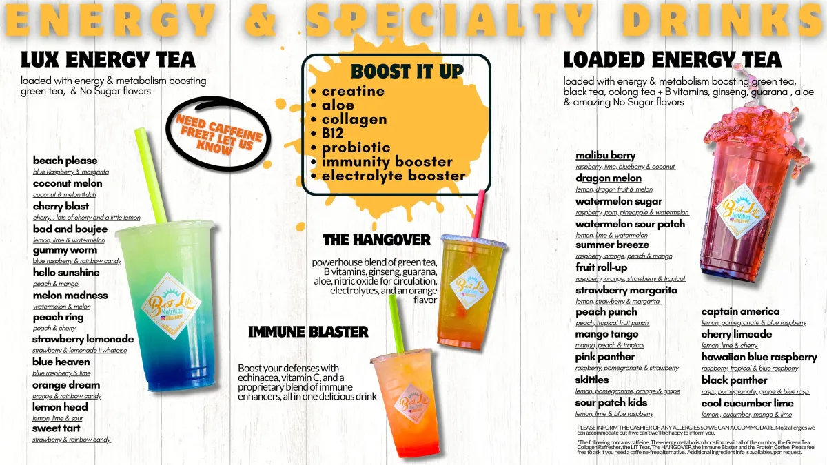 Boost your energy naturally with our flavorful energy teas! Loaded with green tea, aloe, B vitamins, ginseng, and guarana, they're a refreshing way to stay energized and focused throughout the day. With a variety of delicious flavors, there's a perfect pick-me-up for everyone!